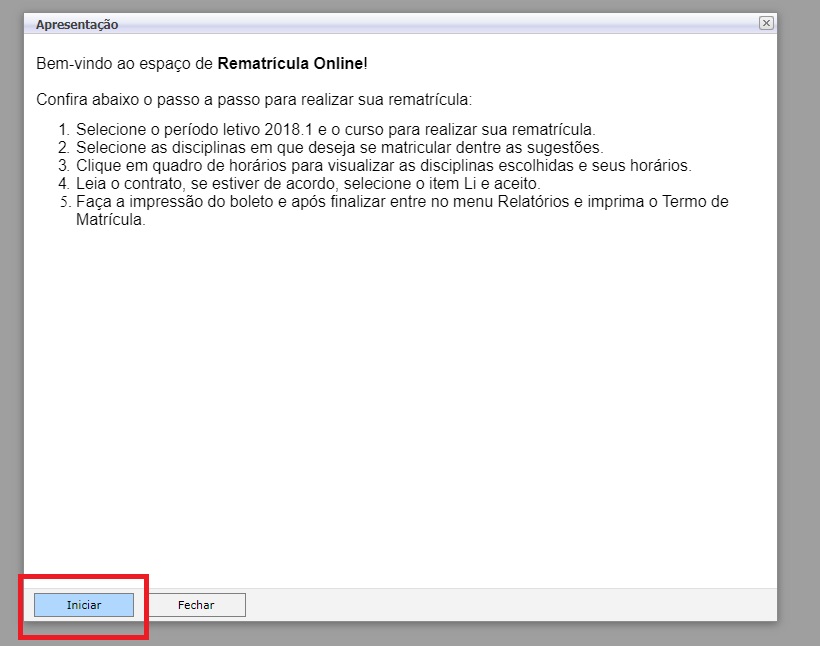 - Clique em Iniciar para prosseguir com a Rematrícula online. (Figura 2)