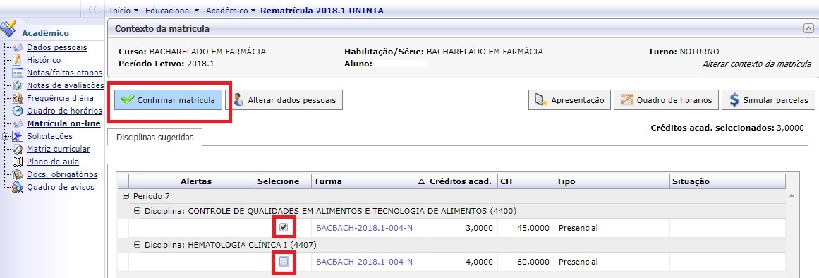- Escolha as disciplinas que deseja cursar, e clique em confirmar matrícula. (Figura 4)