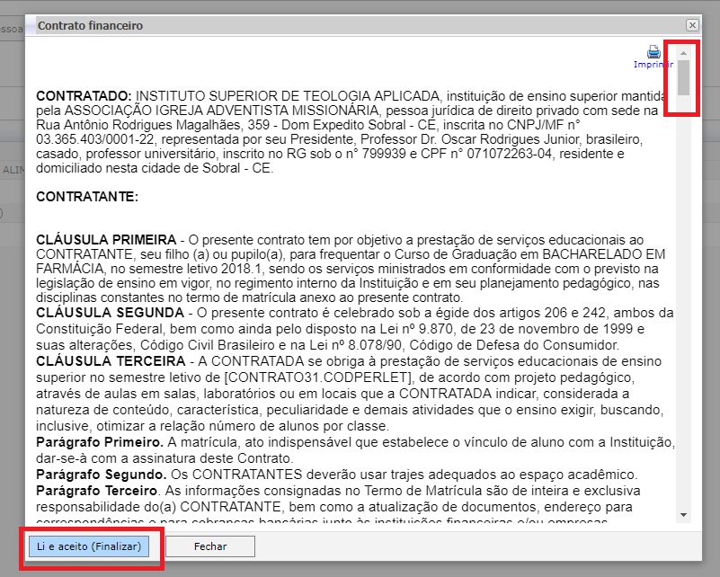 - Leia o contrato financeiro, e em seguida clique em Li e aceito (Finalizar). É necessário visualizar todo o texto do contrato. Use a barra de rolagem para isto. (Figura 5)