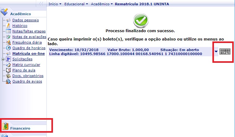 - No Financeiro foi gerado um boleto referente a primeira mensalidade do semestre. Clique no ícone do boleto para imprimir. (Figura 7)